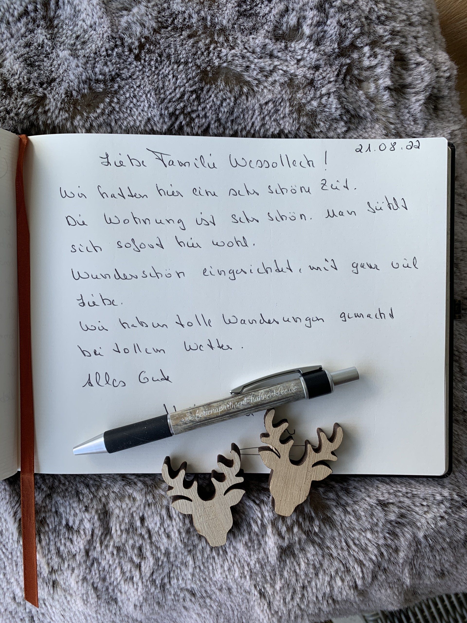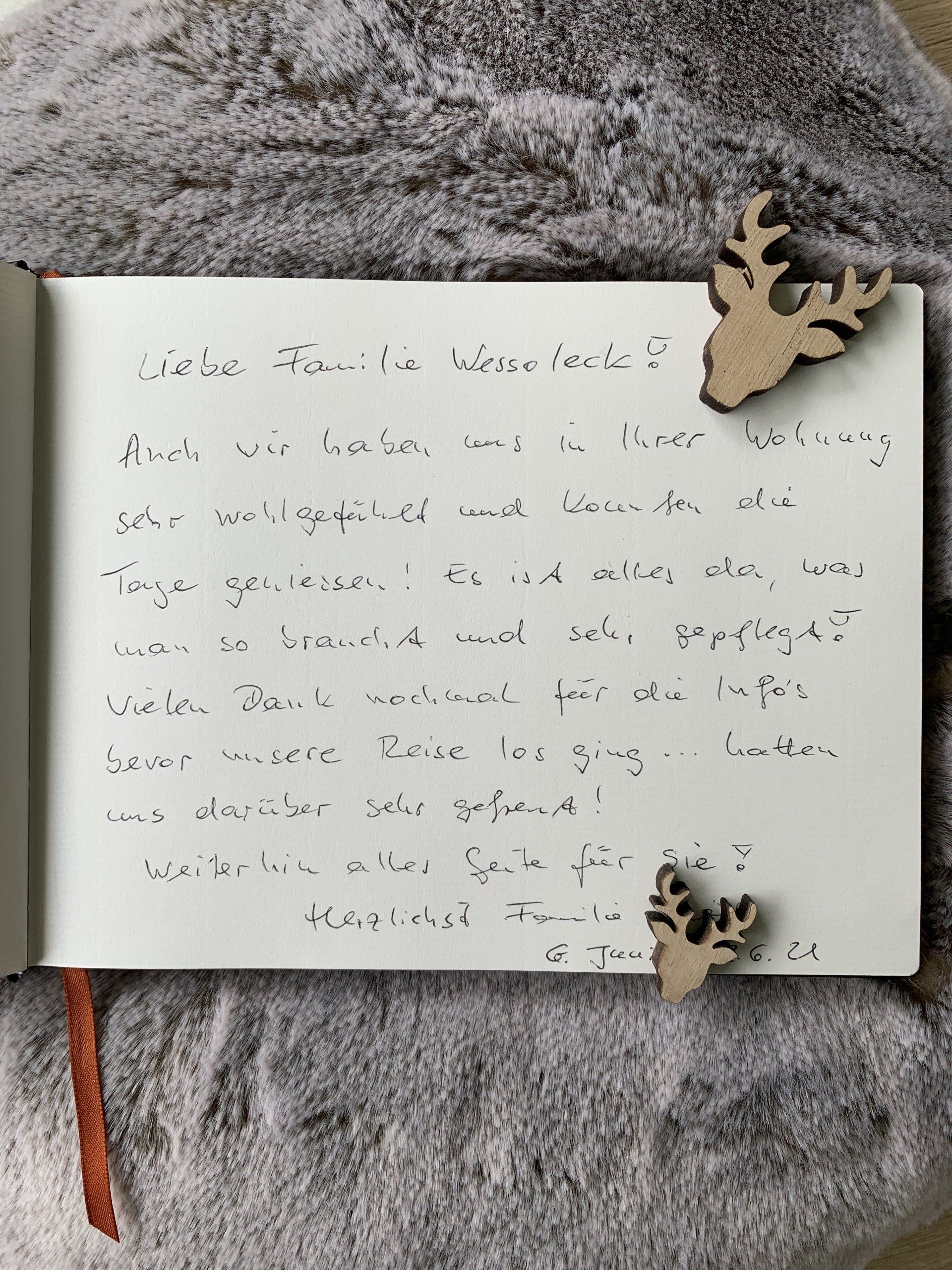 „Aus dem schönen Lipperland kamen wir flott angerannt und fanden an des Bocksberg's Fuße viel Ruhe, Sonne und auch Muße. Ein traumhaftes 'Zuhause auf Zeit' machte uns für viele Unternehmungen bereit. Heut fahren wir leider wieder nach Hause - hoffentlich nur für ein Jahr Pause. Danke sagen wir für diese schöne Zeit und sind für's Wiederkommen sofort bereit! Danke."