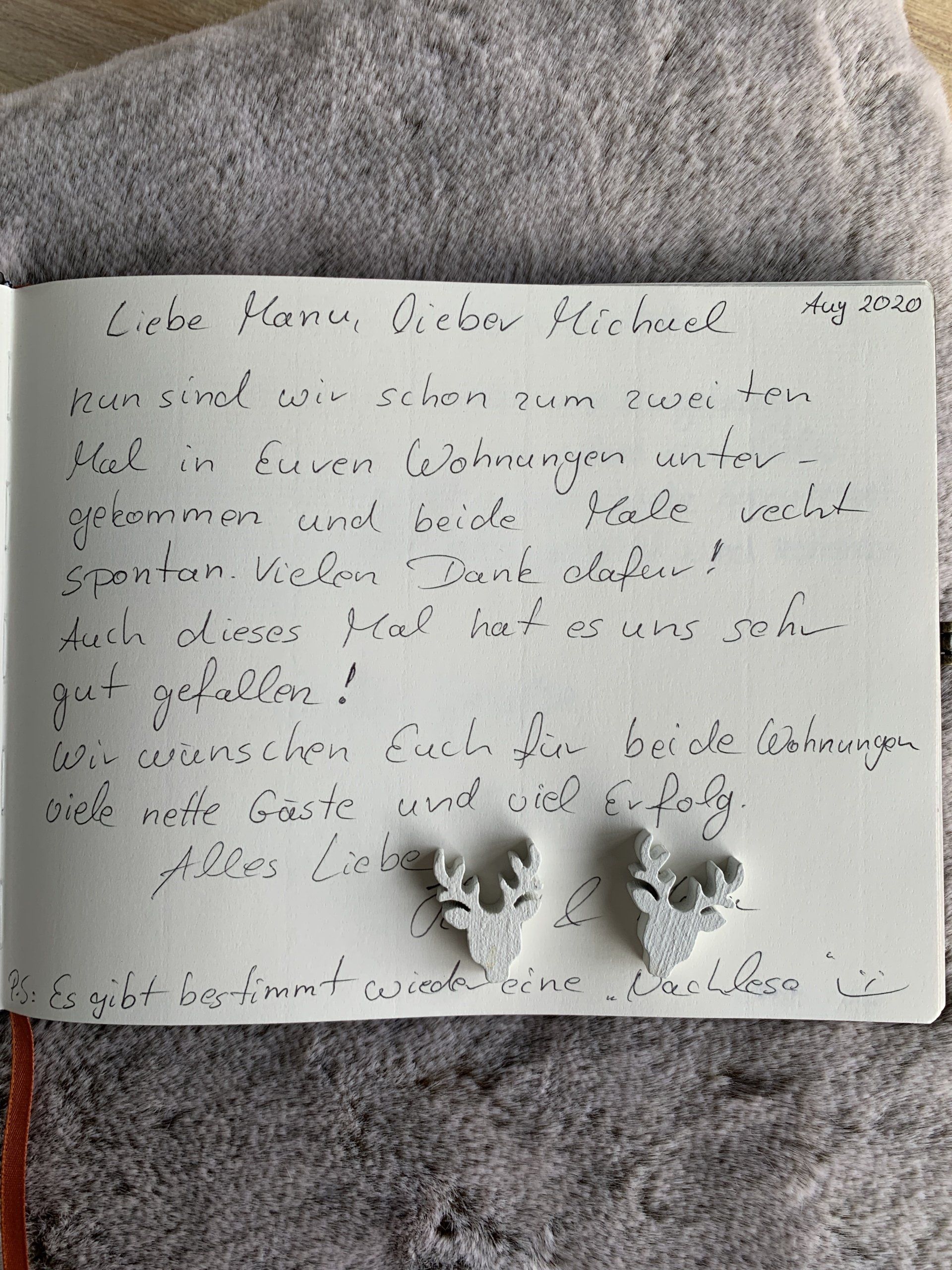 „Liebe Manu, lieber Michael, nun sind wir schon zum zweiten Mal in Euren Wohnungen untergekommen und beide Male recht spontan. Vielen Dank dafür! Auch dieses Mal hat es uns sehr gut gefallen! Wir wünschen Euch für beide Wohnungen viele nette Gäste und viel Erfolg. Alles Liebe.“